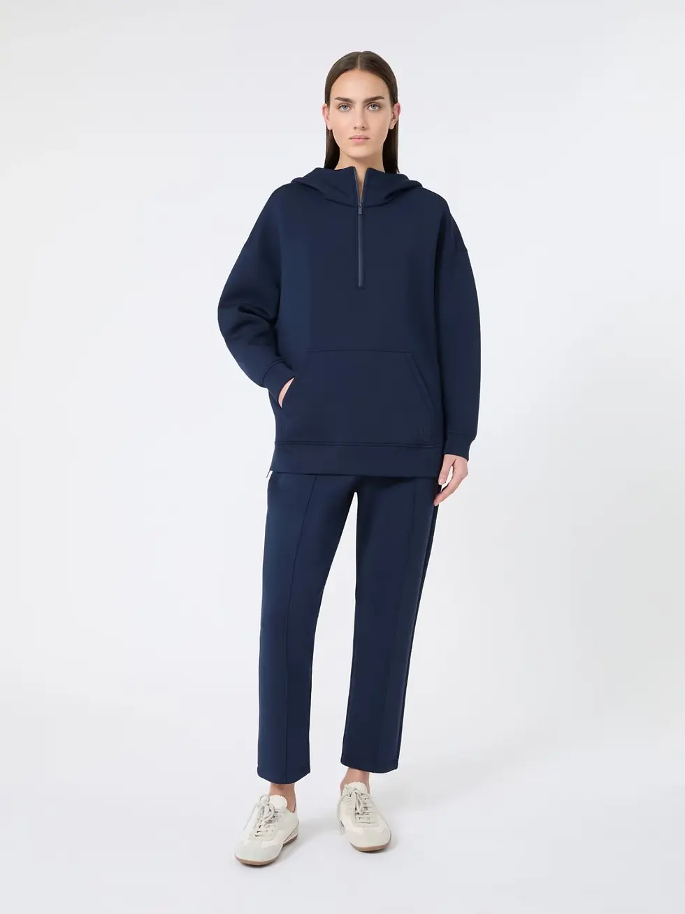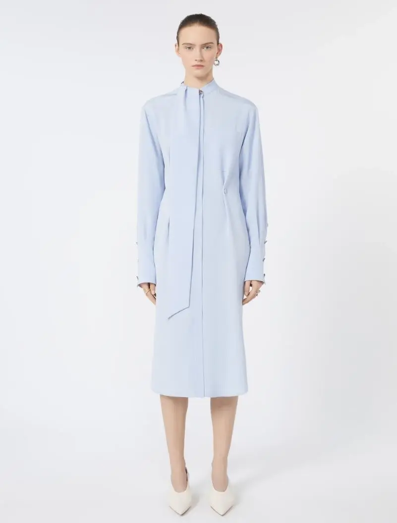 Elegante tuta lunga con scollo a V incrociato realizzata in prezioso crêpe de Chine di pura seta stampata. La silhouette con pantalone ampio è completata da piccole maniche a kimono, tasche a sbieco sui fianchi e cintura abbinata ad evidenziare il punto vita.